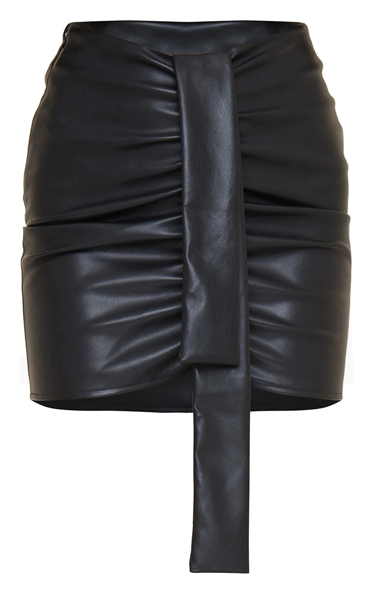 Inject some fierce vibes into your new-season wardrobe doll. Featuring a black faux leather material with ruched detailing and a v front design. Wear with the matching crop top and knee-high boots for an unforgettable finish.