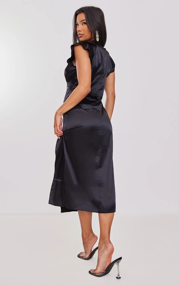 Get ready for the weekend with this midi dress doll. Featuring a black satin material with cap sleeves and lace trim detail. Style with dreamy heels and your fave accessories to complete this unreal look.