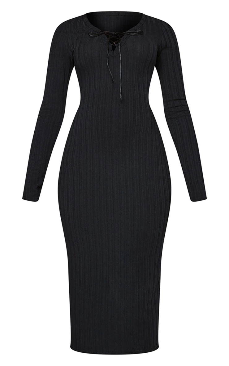 This dress is at the top of our new season hit list. Featuring a black ribbed material with a lace-up detail and a midaxi length. Pair with some chunky boots for an effortlessly chic look.