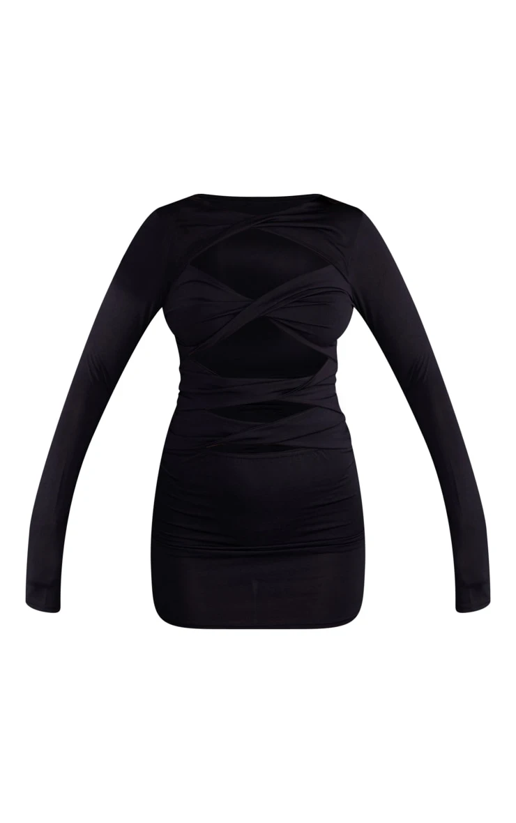 The weekend is calling doll and you need to answer with this bodycon dress. Featuring a black slinky material with a twist front and cut-out detail. Style it with heeled boots and dreamy accessories for a look that is sure top impress.