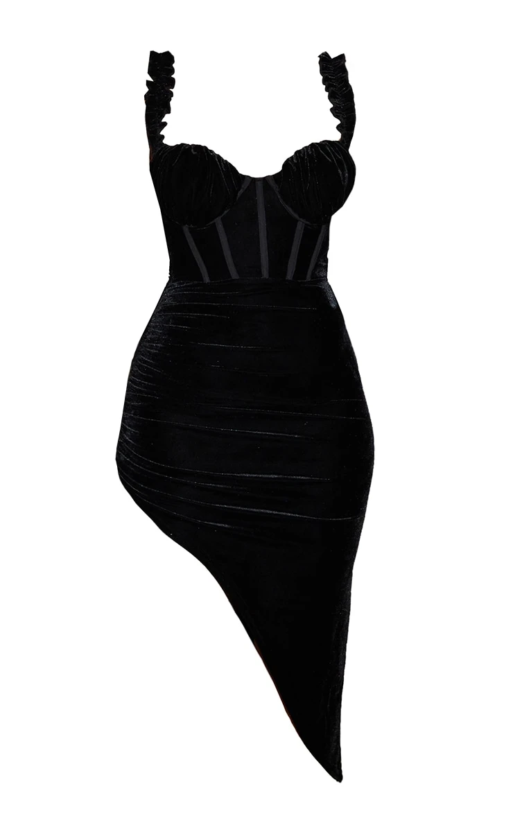 Make sure all eyes are on you with this dress. Featuring a black velvet material with ruffle strap detail, corset waist design and a midi length. Team this with clear strap heels and a mini bag to complete the look.