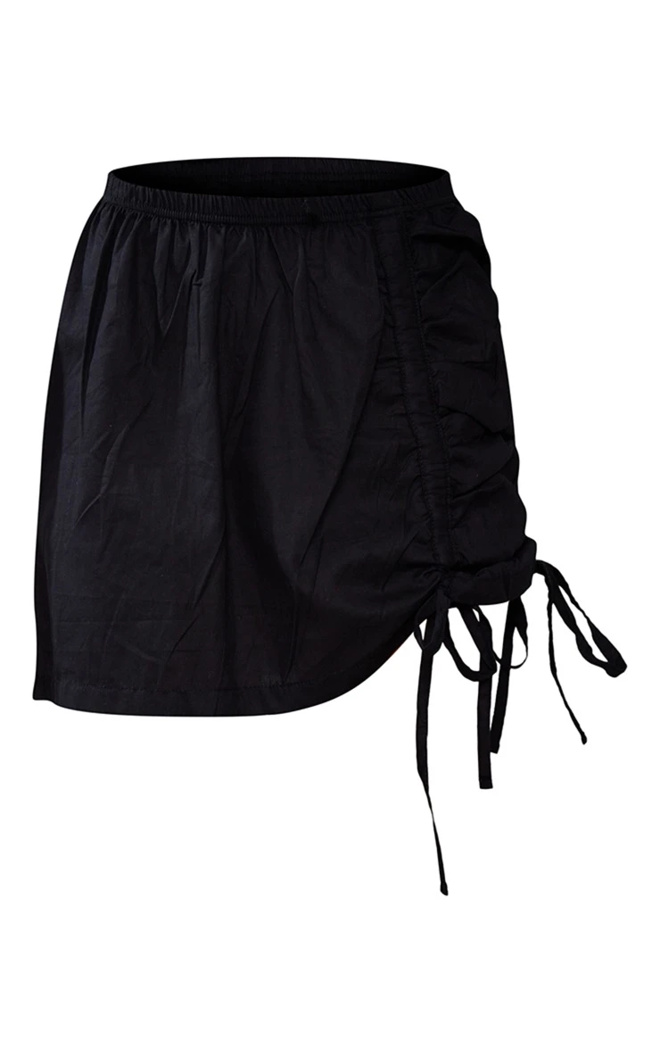 Complete your weekend look with this skirt doll. Featuring a black woven material with ruched detailing, an asymmetric design and a mini length, we’re in love. Just add the matching black shirt, clear high heels and mini bag for a flawless combo.