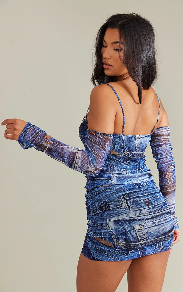 Add some edge to your weekend look with this dress doll. Featuring a blue denim mesh print material with a cold shoulder design and a figure0hugging fit, we’re in love. Wear with lace-up high heels and mini bag for a look that is sure to set trends.