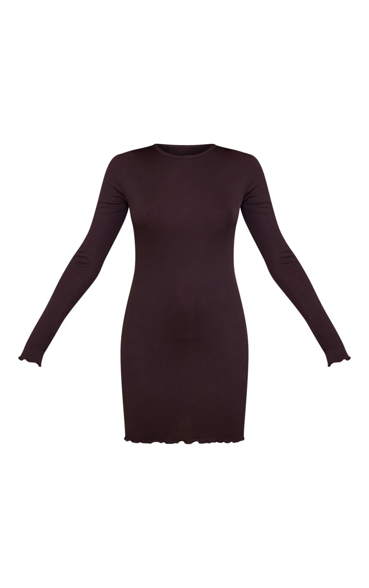 Add some dreamy hues to your look with this dress. Featuring a chocolate ribbed material with a lettuce hem design and a scooped neckline, we’re in love. Style with chunky ankle boots and a shoulder bag to finish.