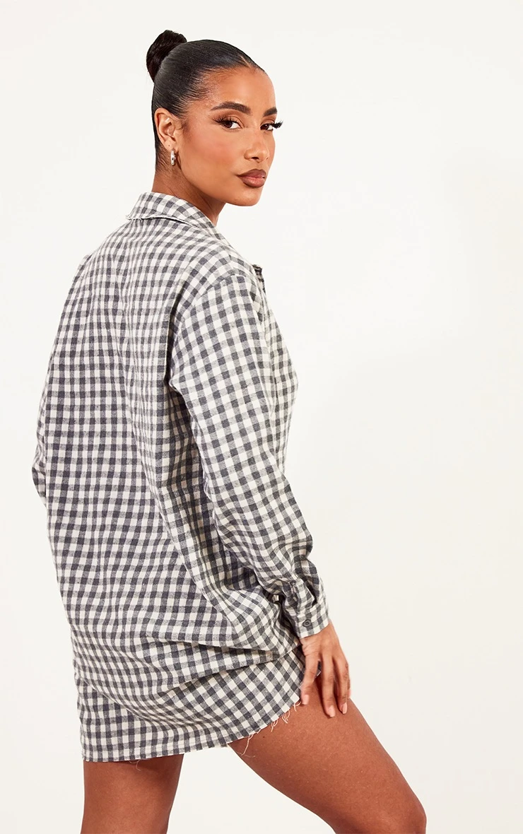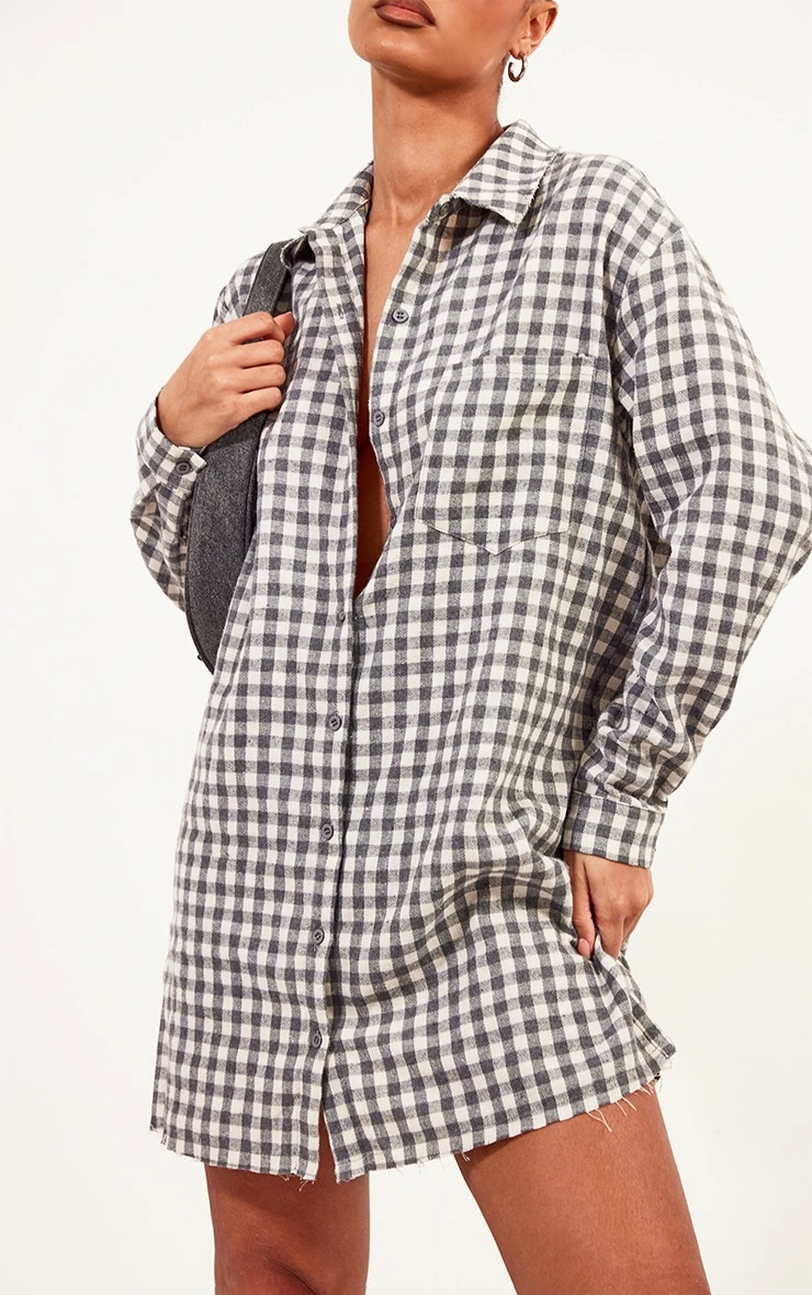 Take your look to a whole new level with this grey brushed check raw hem oversized shirt dress. This piece is sure to be a go-to in your collection. Made using a grey brushed check print material with a raw hem, an oversized design and a relaxed fit that is perfect for off-duty styling, what more could you ask for? It’s simply perfect. Wear with gold hoop earrings fresh kicks and a shoulder bag and you will be ready for the day ahead.