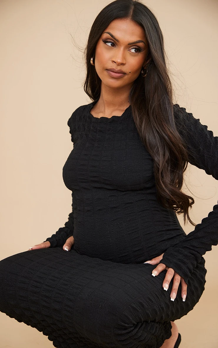 Your new season wardrobe wouldn’t be complete without this maternity black bubble textured midaxi dress, it is perfect for taking your look effortlessly from AM to PM. It features a black material with a bubble textured design and a midaxi length, we’re obsessed. The figure-worshipping fit is sure to have you feeling your best doll. Pair with slip-on heels and simple accessories for the ultimate chic finish.