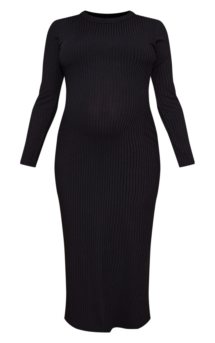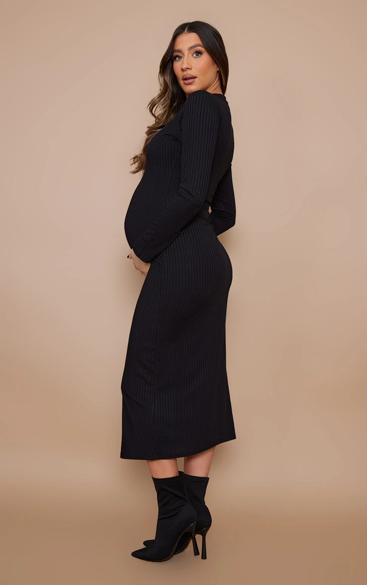 Meet your new season wardrobe staple with this must-have maternity black ribbed long sleeve midi dress, it s perfect for effortless day to night styling. This dress features a black ribbed material with long sleeves and a midi length, the figure-worshipping fit is sure to have you feeling your best doll. Pair with heeled boots and simple accessories for the ultimate chic finish.