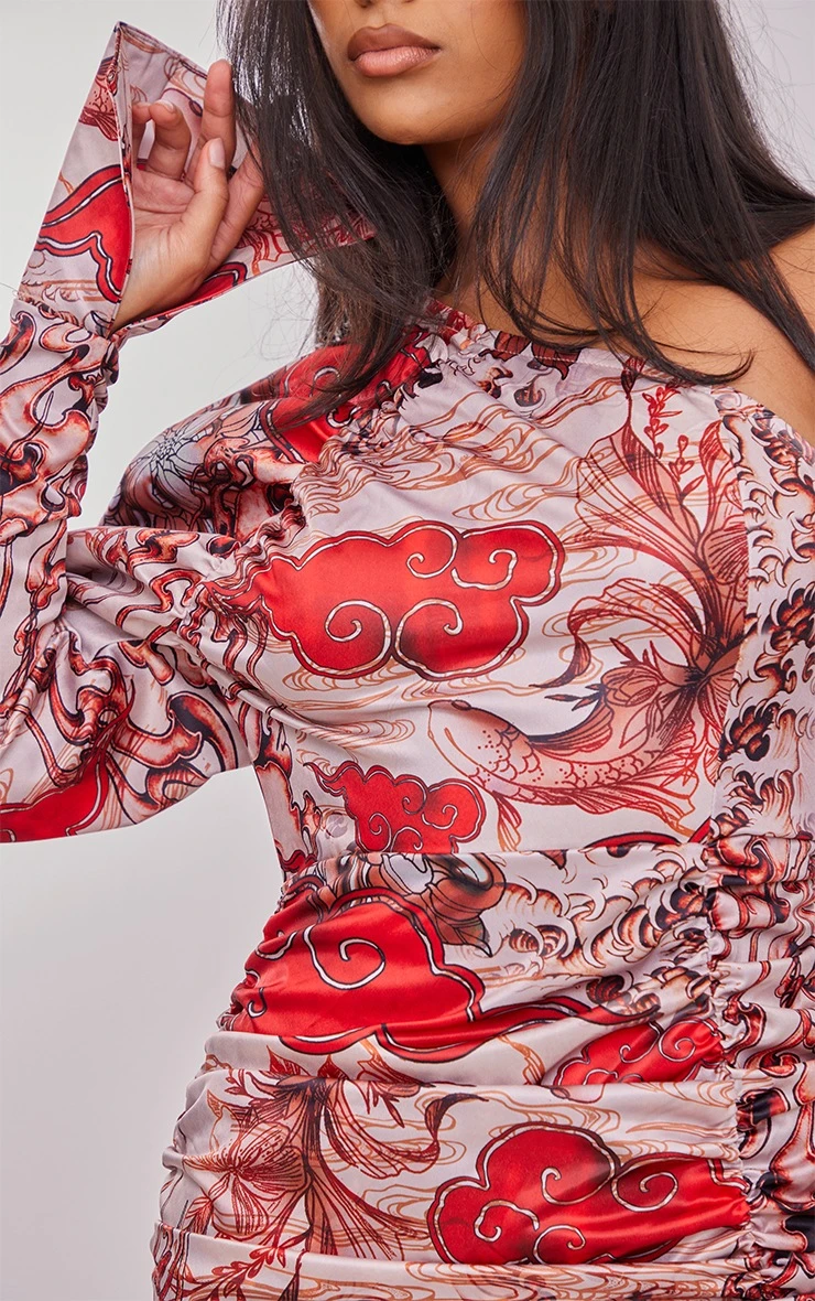 Take your weekend look to new heights with this dress. Featuring a nude tattoo satin print material with a one shoulder design, puff sleeves and ruched detailing, what’s not to love? Wear with your high heels, gold accessories and mini bag for a flawless combo.