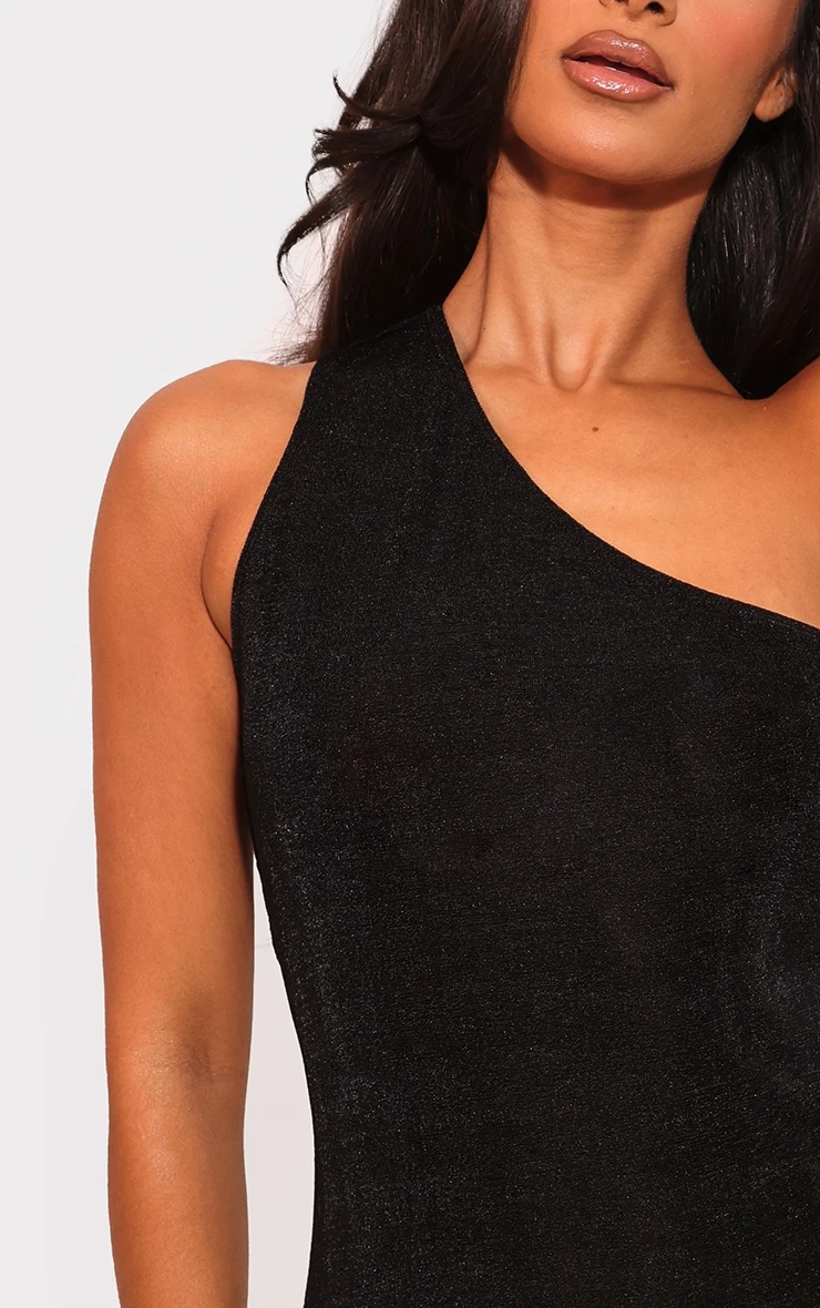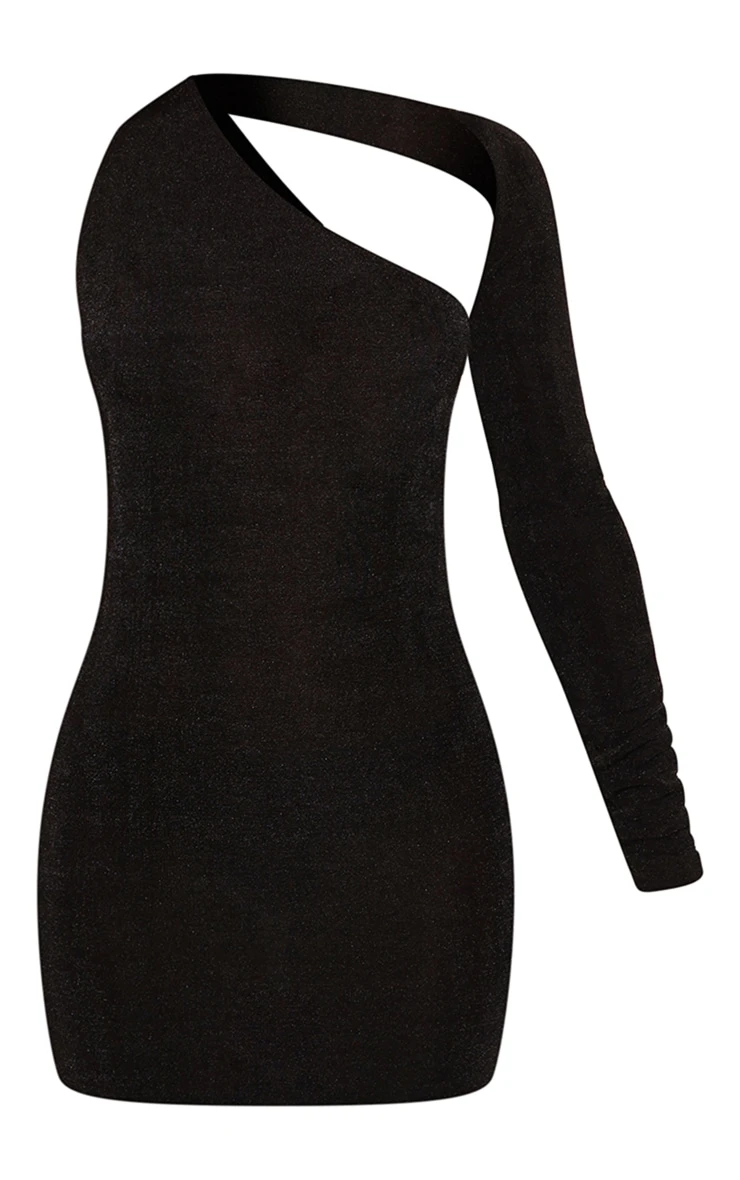Simplistic style is the vibe for this weekend and this bodycon dress is perfect for you. Featuring a black acetate slinky material with a one shoulder design and cut-out detail. For that dreamy look add metallic heels and your fave accessories.