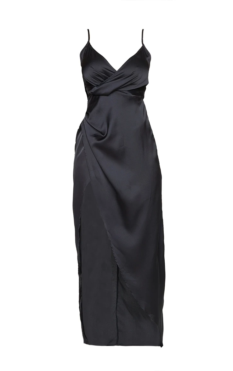 This wrap satin maxi dress is sure to turn heads for all the right reasons. Featuring a black satin material with a wrap detail and a split side, team them with some strappy heels and a mini bag for a look we’re loving.
