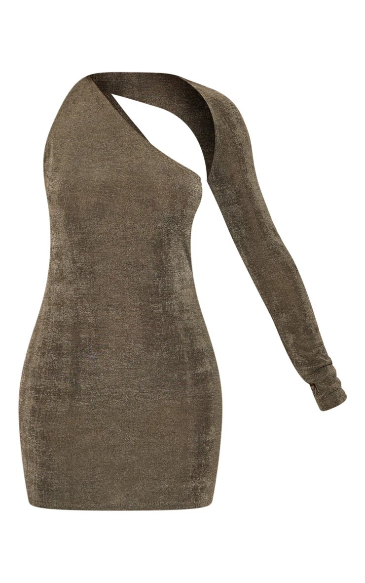 Get ready to show off your shape with this figure-worshipping dress. Featuring a khaki acetate material in a slinky design and a one-shoulder cut-out detail. Pair with some clear heels and minimal accessories for a look that will turn heads.