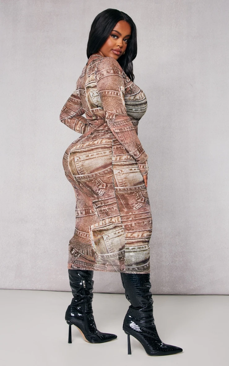 Earn some extra styling points with this midi dress. Featuring a beige mesh material with a denim print, long sleeves and a figure-worshipping fit, we are in love. Wear with knee-high boots, accessories and a bag to bring the whole look together.