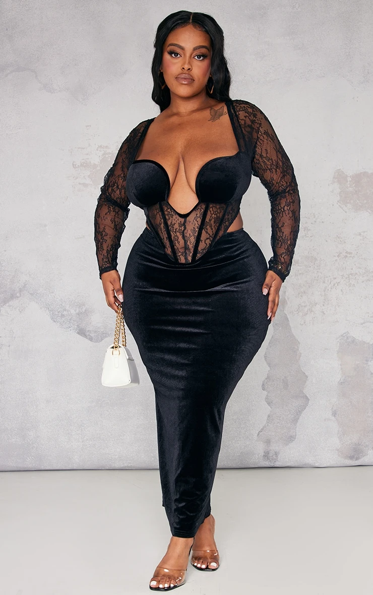 Your special occasion look is finally found with this dress doll. Featuring a black velvet material with a lace detail corset and a midaxi length, we’re obsessed. Wear with your clear high heels and accessories to glam up the vibe.