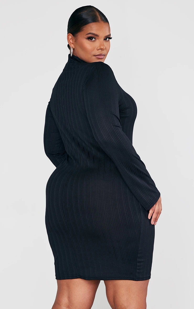 Get that effortlessly chic vibe on point with this dress. Featuring a black ribbed material with a high neck design and a figure-hugging fit. Pair with heeled boots and a blazer for a look we’re obsessing over.