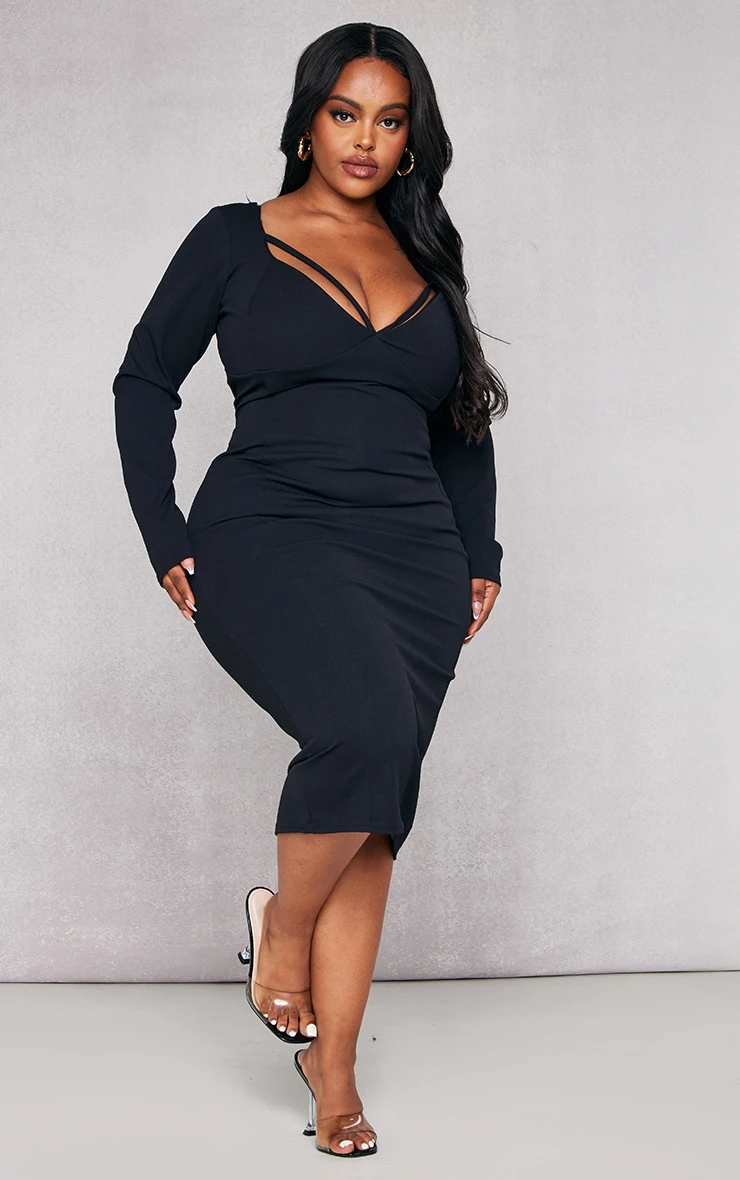 Get ready to steal all the stares with this staple midi dress. Featuring a black material with a strap detailing, long sleeves and a flattering fit, we are in love. Team with clear heels, accessories and a mini bag for a head-turning combo.