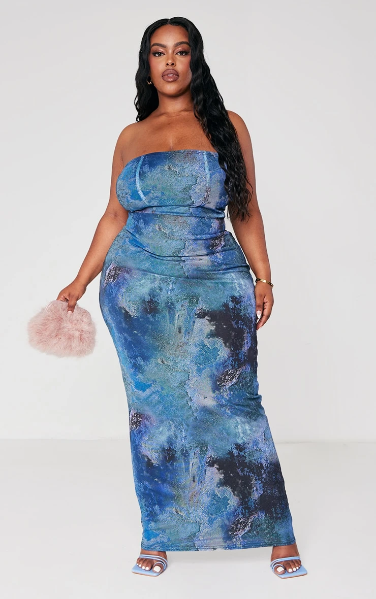 Set serious trends with this dress. Featuring a blue abstract print mesh material in a bandeau style and midaxi length, we’re in love. Pair with baby blue high heels and a faux fur clutch bag to elevate the vibe.