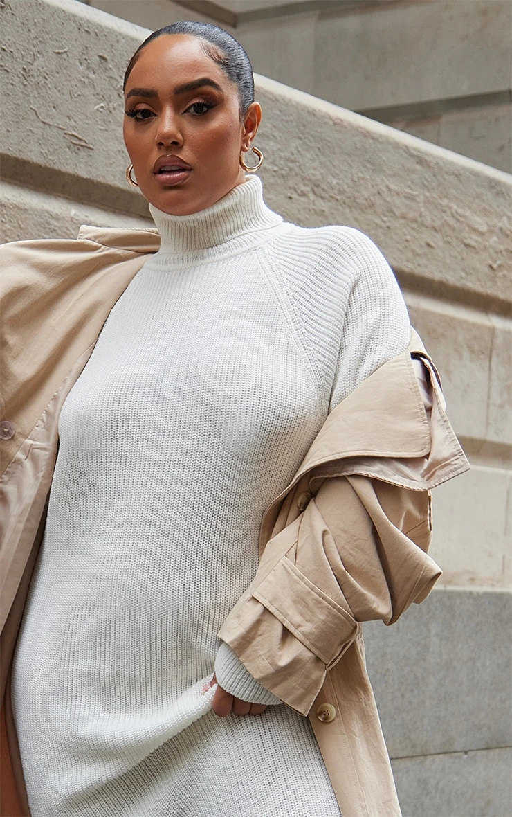 Take your knitwear collection to a whole new level with this must-have Sweatshirt dress. Featuring a a cream knit material with a roll neck, an oversized design and a midi length, we are obsessed. Wear with a trench coat and knee high boots for a look that won’t go unnoticed.