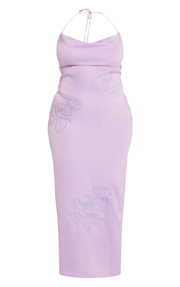This plus lilac halterneck satin embroidered maxi dress is all you need to have hearts racing this season. Brought to you in a lilac satin material for a touch of luxe we are obsessing over. With its embroidered detail and halterneck design, what more could you want? Simply style with some clear heels and a pair of gold hoops for an insta worthy look everyone is talking about.