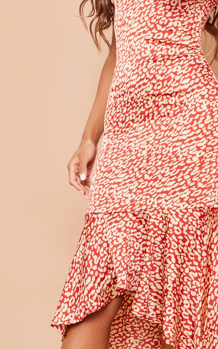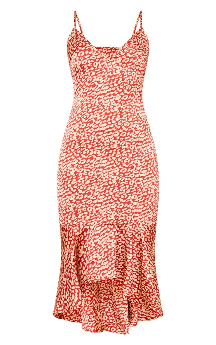 Worship your shape with this midi dress. Featuring a red leopard print satin fabric with a frill hem design and thin shoulder straps, style it with some strappy heels and a mini bag for a special occasion look.