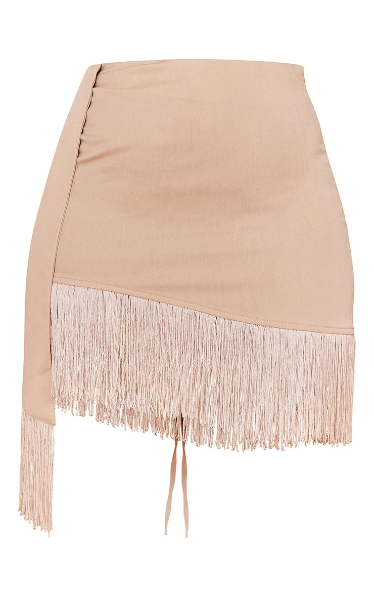 Give your look a chic update with this mini skirt. Featuring a sand woven material with a drape front design and fringe detailing, we are obsessed. Team this with a crop top and heeled mules to complete the look.