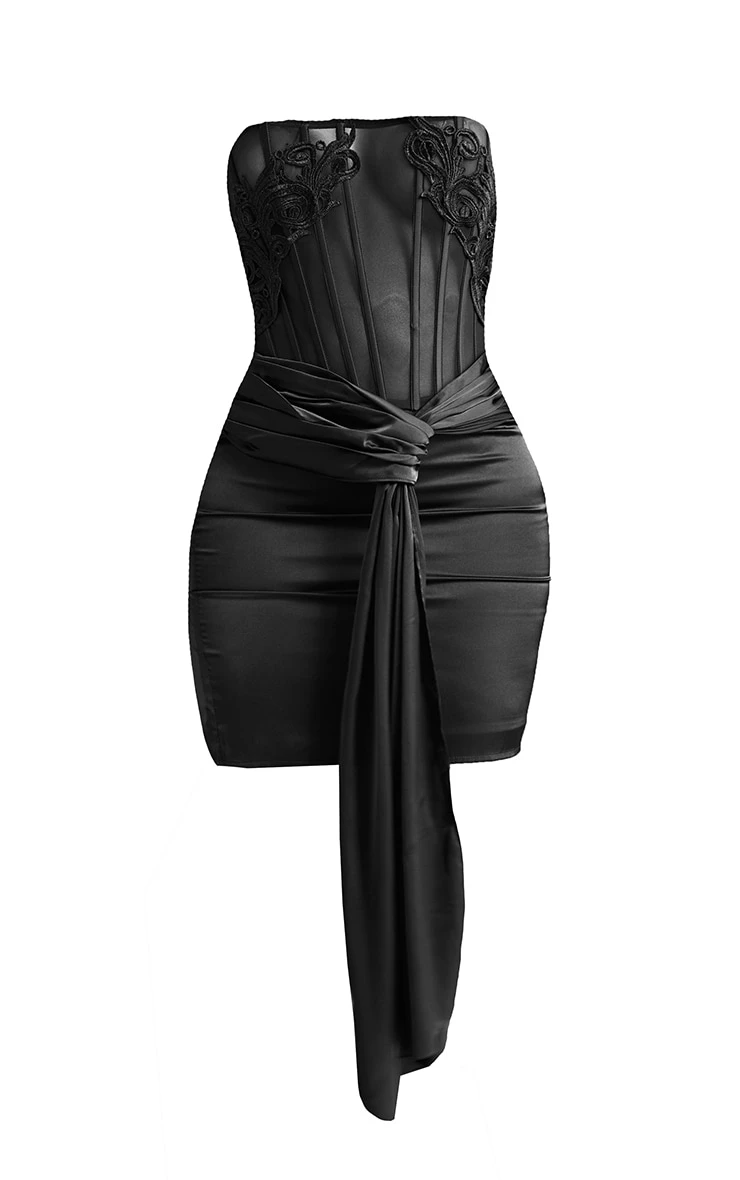 Have heads turning for all the right reasons with this dress. Featuring a black satin material with a corset design and a figure-skimming fit. Style this with strappy heels and simple accessories to complete the look.