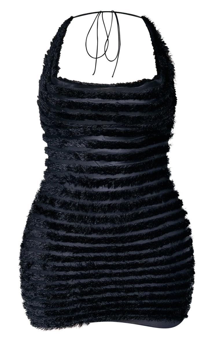 Channel all the glam vibes into your new season wardrobe with this dress. Featuring a black textured material with a cowl neckline, a backless design and a figure-hugging fit, we’re in love. Pair with tie-up heels and hoop earrings for a night with the dolls.