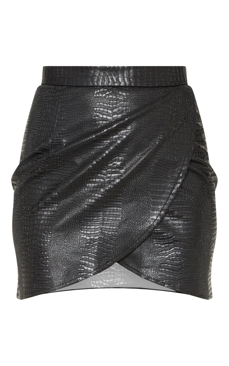 A faux leather skirt is a must-have in every wardrobe and this style is included. Featuring a black snake effect fabric with a wrap over design, style with a printed bodysuit for a look we are loving.