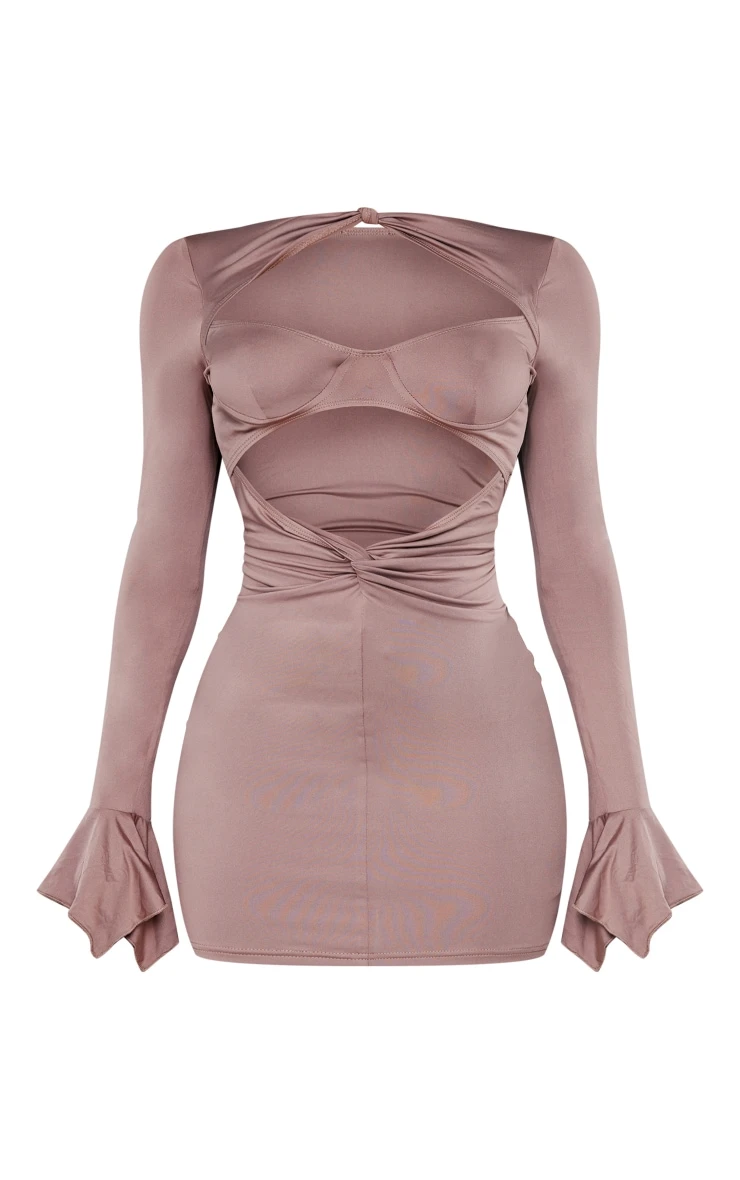 Your weekend look has never been so on-point with this taupe cut-out lace cup detail flared sleeve bodycon dress. If you have weekend plans with the dolls this dress has got you covered. Made with a taupe material, a cut-out front, lace cup detailing and flared sleeves this dreamy dress is sure to make heads turn for all the right reasons. Effortlessly style with your trusty high heels and statement accessories for next level look.