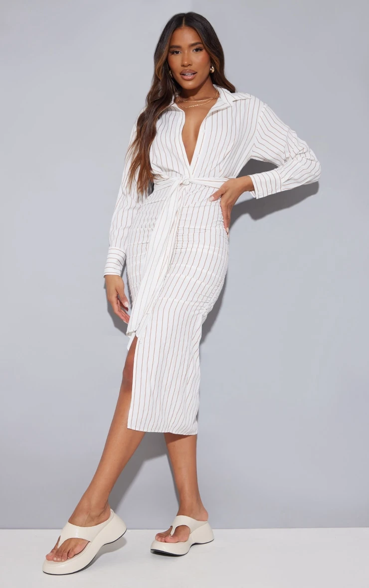 This dress is sure to be at the top of your new season hit list doll. Featuring a white stripe print material with a tie waist design and a midi length. Style with sandals and a clutch back for a next level look we’re loving.